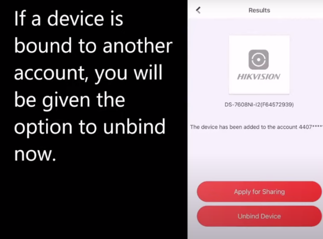 - Open the Hik Connect app select add device and then chose to unbind (see video below)