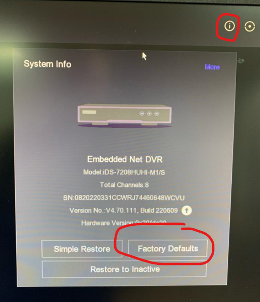 - At the main menu screen click on the highlighted icon and choose factory default or select configuration and maintenance option and default the recorder
